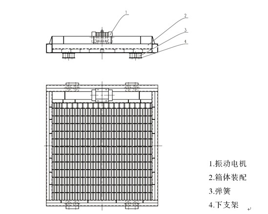 振動(dòng)篦板由振動(dòng)體、振動(dòng)電機(jī)、支撐彈簧、彈簧支座等組成。篦板為焊接結(jié)構(gòu),篦孔尺寸根據(jù)物料種類(lèi)和用戶(hù)要求而定。篦板的支撐彈簧為橡膠彈簧或螺旋鋼制彈簧,根據(jù)現(xiàn)場(chǎng)的安裝環(huán)境,彈簧或者布置在篦板的兩個(gè)側(cè)邊下部,或者布置在篦板的四個(gè)邊的下部。