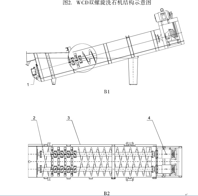螺旋洗石機(jī)由槽體、減速機(jī)、電機(jī)、中心軸、螺旋葉片、支架組成。支架焊接在中心軸上,螺旋葉片裝好后用螺栓壓緊,使葉片不下垂不變形。